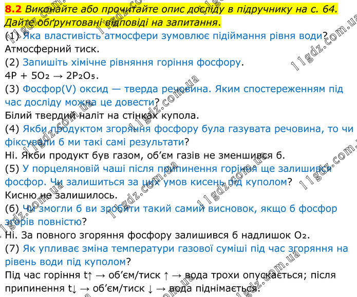 8.2 Виконайте або прочитайте опис досліду в підручнику на с. 64. Дайте обґрунтовані відповіді на запитання. (1) Яка властивість атмосфери зумовлює підіймання рівня води? Атмосферний тиск. (2) Запишіть хімічне рівняння горіння фосфору. 4P + 5O₂ → 2P₂O₅. (3) Фосфор(V) оксид — тверда речовина. Яким спостереженням під час досліду можна це довести? Білий твердий наліт на стінках купола. (4) Якби продуктом згоряння фосфору була газувата речовина, то чи фіксували б ми такі самі результати? Ні. Якби продукт був газом, об’єм газів не зменшився б. (5) У порцеляновій чаші після припинення горіння ще залишився фосфор. Чи залишиться за цих умов кисень під куполом? Кисню не залишилось. (б) Чи змогли б ви зробити такий самий висновок, якщо б фосфор згорів повністю? Ні. За повного згоряння фосфору залишився б надлишок O₂. (7) Як упливає зміна температури газової суміші під час згоряння на рівень води під куполом? Під час горіння t↑ → об’єм/тиск ↑ → вода трохи опускається; після припинення t↓ → об’єм/тиск ↓ → вода піднімається.