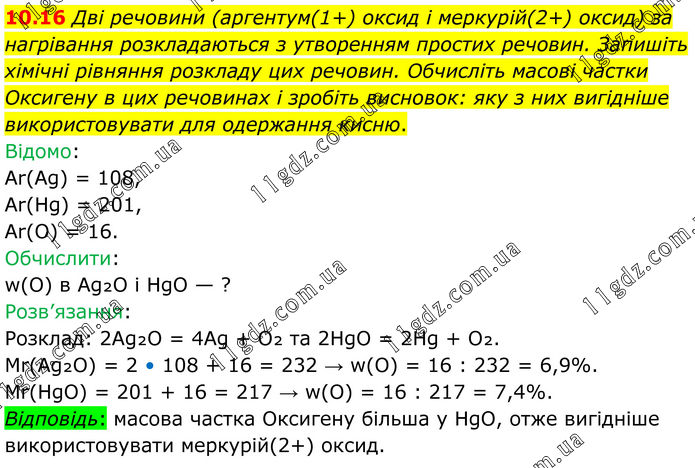 10. 16 Дві речовини (аргентум(1+) оксид і меркурій(2+) оксид) за нагрівання розкладаються з утворенням простих речовин. Запишіть хімічні рівняння розкладу цих речовин. Обчисліть масові частки Оксигену в цих речовинах і зробіть висновок: яку з них вигідніше використовувати для одержання кисню. Відомо: Ar(Ag) = 108, Ar(Hg) = 201, Ar(O) = 16. Обчислити: w(O) в Ag₂O і HgO — ? Розв’язання: Розклад: 2Ag₂O = 4Ag + O₂ та 2HgO = 2Hg + O₂. Mr(Ag₂O) = 2 • 108 + 16 = 232 → w(O) = 16 : 232 = 6,9%. Mr(HgO) = 201 + 16 = 217 → w(O) = 16 : 217 = 7,4%. Відповідь: масова частка Оксигену більша у HgO, отже вигідніше використовувати меркурій(2+) оксид.