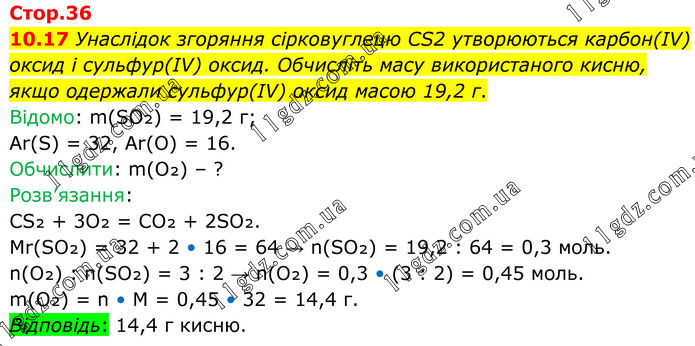 10.17 Унаслідок згоряння сірковуглецю CS2 утворюються карбон(ІV) оксид і сульфур(ІV) оксид. Обчисліть масу використаного кисню, якщо одержали сульфур(ІV) оксид масою 19,2 г. Відомо: m(SO₂) = 19,2 г; Ar(S) = 32, Ar(O) = 16. Обчислити: m(O₂) – ? Розв’язання: CS₂ + 3O₂ = CO₂ + 2SO₂. Mr(SO₂) = 32 + 2 • 16 = 64 → n(SO₂) = 19,2 : 64 = 0,3 моль. n(O₂) : n(SO₂) = 3 : 2 → n(O₂) = 0,3 • (3 : 2) = 0,45 моль. m(O₂) = n • M = 0,45 • 32 = 14,4 г. Відповідь: 14,4 г кисню.