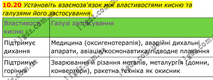 10.20 Установіть взаємозв'язок між властивостями кисню та галузями його застосування. Властивості кисню Галузі застосування Підтримує дихання Медицина (оксигенотерапія), аварійні дихальні апарати, авіація/космонавтика/підводне плавання. Підтримує горіння Зварювання й різання металів, металургія (домни, конвертери), ракетна техніка як окисник.
