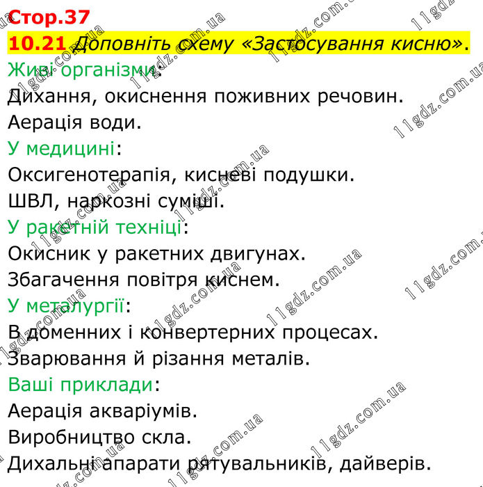 10.21 Доповніть схему «Застосування кисню». Живі організми: Дихання, окиснення поживних речовин. Аерація води. У медицині: Оксигенотерапія, кисневі подушки. ШВЛ, наркозні суміші. У ракетній техніці: Окисник у ракетних двигунах. Збагачення повітря киснем. У металургії: В доменних і конвертерних процесах. Зварювання й різання металів. Ваші приклади: Аерація акваріумів. Виробництво скла. Дихальні апарати рятувальників, дайверів.