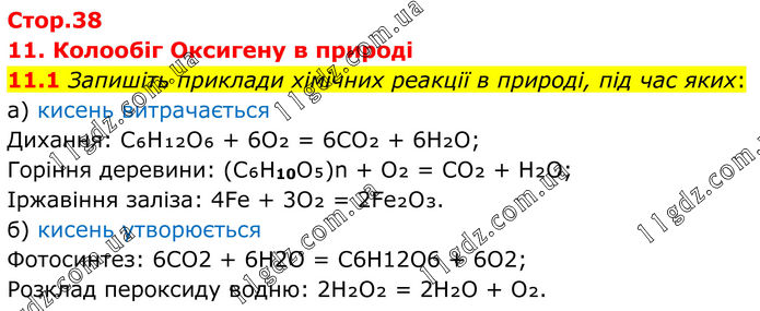 11. Колообіг Оксигену в природі 11.1 Запишіть приклади хімічних реакції в природі, під час яких: а) кисень витрачається Дихання: C₆H₁₂O₆ + 6O₂ = 6CO₂ + 6H₂O; Горіння деревини: (C₆H10O₅)n + O₂ = CO₂ + H₂O; Іржавіння заліза: 4Fe + 3O₂ = 2Fe₂O₃. б) кисень утворюється Фотосинтез: 6CO2 + 6H2O = C6H12O6 + 6O2; Розклад пероксиду водню: 2H₂O₂ = 2H₂O + O₂.