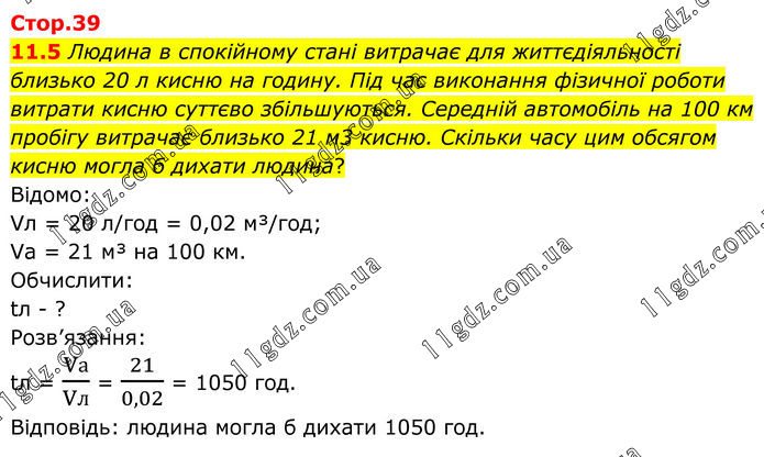 11.5 Людина в спокійному стані витрачає для життєдіяльності близько 20 л кисню на годину. Під час виконання фізичної роботи витрати кисню суттєво збільшуються. Середній автомобіль на 100 км пробігу витрачає близько 21 м3 кисню. Скільки часу цим обсягом кисню могла б дихати людина? Відомо: Vл = 20 л/год = 0,02 м³/год; Vа = 21 м³ на 100 км. Обчислити: tл - ? Розв’язання: tл = Vа/Vл = 21/0,02 = 1050 год. Відповідь: людина могла б дихати 1050 год.