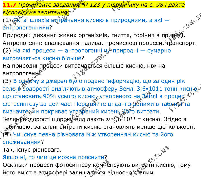 11.7 Прочитайте завдання № 123 у підручнику на с. 98 і дайте відповіді на запитання. (1) Які зі шляхів витрачання кисню є природними, а які — антропогенними? Природні: дихання живих організмів, гниття, горіння в природі. Антропогенні: спалювання палива, промислові процеси, транспорт. (2) На які процеси — антропогенні чи природні — сумарно витрачається кисню більше? На природні процеси витрачається більше кисню, ніж на антропогенні. (3) В одному з джерел було подано інформацію, що за один рік зелені водорості виділяють в атмосферу Землі 3,6•1011 тонн кисню, що становить 90% усього кисню, утвореного на Землі в процесі фотосинтезу за цей час. Порівняйте ці дані з даними в таблиці та визначте, чи покриває утворений кисень його витрати. Зелені водорості щороку виділяють ≈ 3,6∙10¹¹ т кисню. Згідно з таблицею, загальні витрати кисню становлять менше цієї кількості. (4) Чи існує певна рівновага між утворенням кисню та його споживанням? Так, існує рівновага. Якщо ні, то чим це можна пояснити? Оскільки процеси фотосинтезу компенсують витрати кисню, тому його вміст в атмосфері залишається відносно сталим.