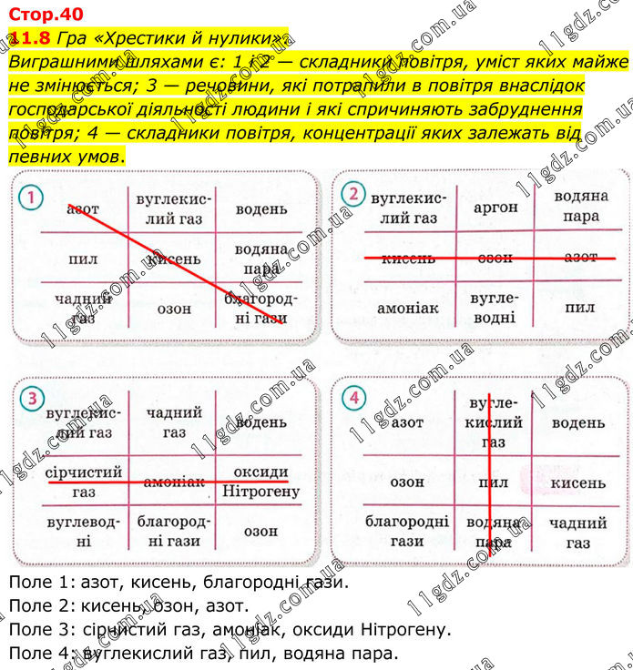 11.8 Гра «Хрестики й нулики». Виграшними шляхами є: 1 і 2 — складники повітря, уміст яких майже не змінюється; 3 — речовини, які потрапили в повітря внаслідок господарської діяльності людини і які спричиняють забруднення повітря; 4 — складники повітря, концентрації яких залежать від певних умов. Поле 1: азот, кисень, благородні гази. Поле 2: кисень, озон, азот. Поле 3: сірчистий газ, амоніак, оксиди Нітрогену. Поле 4: вуглекислий газ, пил, водяна пара.