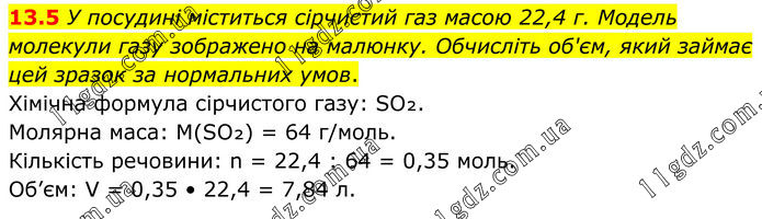 13.5 У посудині міститься сірчистий газ масою 22,4 г. Модель мо лекули газу зображено на малюнку. Обчисліть об'єм, який займає цей зразок за нормальних умов. Хімічна формула сірчистого газу: SO₂. Молярна маса: M(SO₂) = 64 г/моль. Кількість речовини: n = 22,4 : 64 = 0,35 моль. Об’єм: V = 0,35 • 22,4 = 7,84 л.