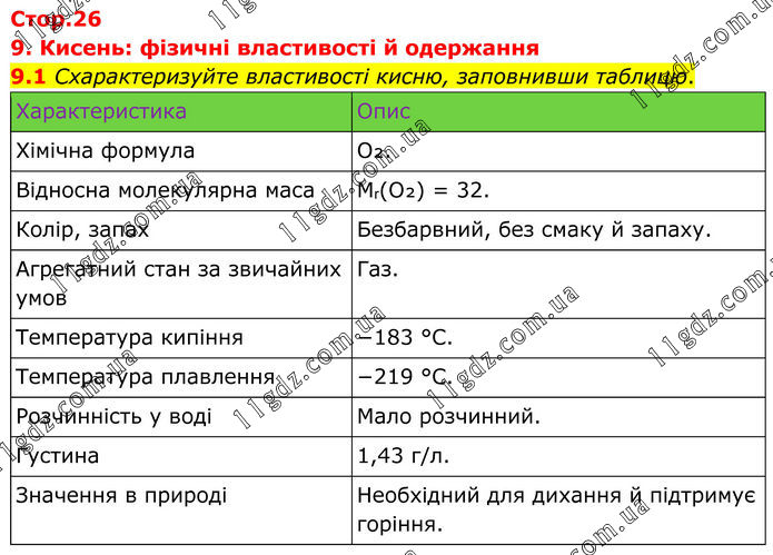 9. Кисень: фізичні властивості й одержання 9.1 Схарактеризуйте властивості кисню, заповнивши таблицю. Характеристика Опис Хімічна формула O₂. Відносна молекулярна маса Mᵣ(O₂) = 32. Колір, запах Безбарвний, без смаку й запаху. Агрегатний стан за звичайних умов Газ. Температура кипіння −183 °C. Температура плавлення −219 °C. Розчинність у воді Мало розчинний. Густина 1,43 г/л. Значення в природі Необхідний для дихання й підтримує горіння.