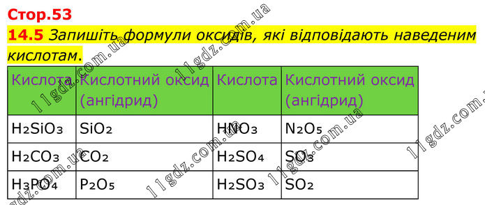 14.5 Запишіть формули оксидів, які відповідають наведен им кислотам. Кислота Кислотний оксид (ангідрид) Кислота Кислотний оксид (ангідрид) H₂SiO₃ SiO₂ HNO₃ N₂O₅ H₂CO₃ CO₂ H₂SO₄ SO₃ H₃PO₄ P₂O₅ H₂SO₃ SO₂