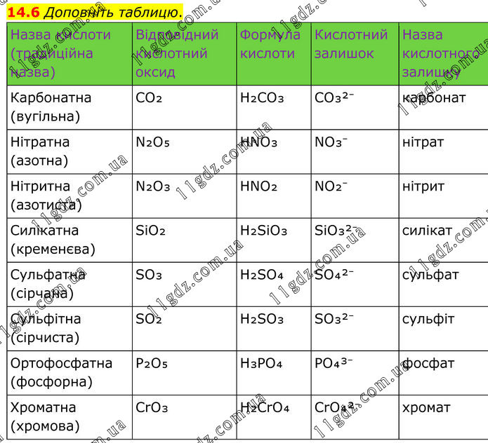 14.6 Доповніть таблицю. Назва кислоти (традиційна назва) Відповідний кислотний оксид Формула кислоти Кислотний залишок Назва кислотного залишку Карбонатна (вугільна) CO₂ H₂CO₃ CO₃²⁻ карбонат Нітратна (азотна) N₂O₅ HNO₃ NO₃⁻ нітрат Нітритна (азотиста) N₂O₃ HNO₂ NO₂⁻ нітрит Силікатна (кременєва) SiO₂ H₂SiO₃ SiO₃²⁻ силікат Сульфатна (сірчана) SO₃ H₂SO₄ SO₄²⁻ сульфат Сульфітна (сірчиста) SO₂ H₂SO₃ SO₃²⁻ сульфіт Ортофосфатна (фосфорна) P₂O₅ H₃PO₄ PO₄³⁻ фосфат Хроматна (хромова) CrO₃ H₂CrO₄ CrO₄²⁻ хромат