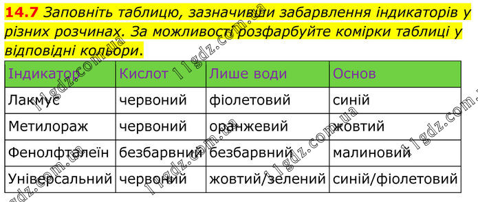 14.7 Заповніть таблицю, зазначивши забарвлення індикаторів у р ізних розчинах. За можливості розфарбуйте комірки таблиці у відповідні кольори. Індикатор Кислот Лише води Основ Лакмус червоний фіолетовий синій Метилораж червоний оранжевий жовтий Фенолфталеїн безбарвний безбарвний малиновий Універсальний червоний жовтий/зелений синій/фіолетовий