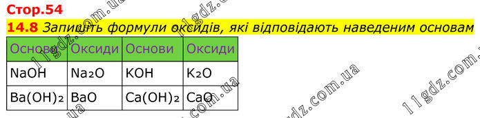14.8 Запишіть формули оксидів, які відповідають наведеним основам Основи Оксиди Основи Оксиди NaOH Na₂O KOH K₂O Ba(OH)₂ BaO Ca(OH)₂ CaO