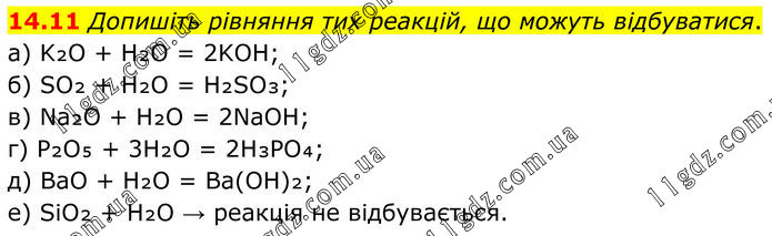 14.11 Допишіть рівняння тих реакцій, що можуть відбуватися. а) K₂O + H₂O = 2KOH; б) SO₂ + H₂O = H₂SO₃; в) Na₂O + H₂O = 2NaOH; г) P₂O₅ + 3H₂O = 2H₃PO₄; д) BaO + H₂O = Ba(OH)₂; е) SiO₂ + H₂O → реакція не відбувається.