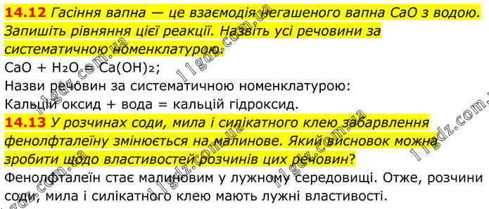 14.12 Гасіння вапна — це взаємодія негашеного вапна CaO з водою. Запишіть рівняння цієї реакції. Назвіть усі речовини за систематичною номенклатурою. CaO + H₂O = Ca(OH)₂; Назви речовин за систематичною номенклатурою: Кальцій оксид + вода = кальцій гідроксид. 14.13 У розчинах соди, мила і силікатного клею забарвлення фенолфталеїну змінюється на малинове. Який висновок можна зробити щодо властивостей розчинів цих речовин? Фенолфталеїн стає малиновим у лужному середовищі. Отже, розчини соди, мила і силікатного клею мають лужні властивості.
