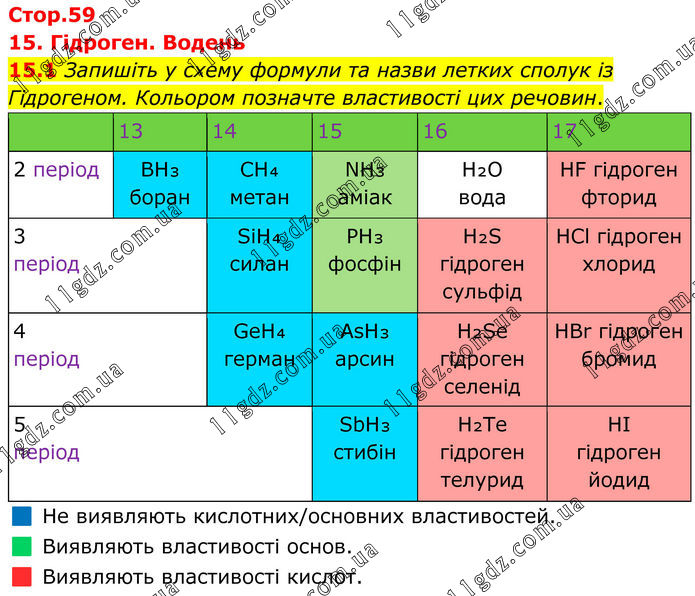 15. Гідроген. Водень 15.1 Запишіть у схему фор мули та назви летких сполук із Гідрогеном. Кольором позначте властивості цих речовин. 13 14 15 16 17 2 період BH₃ боран CH₄ метан NH₃ аміак H₂O вода HF гідроген фторид 3 період SiH₄ силан PH₃ фосфін H₂S гідроген сульфід HCl гідроген хлорид 4 період GeH₄ герман AsH₃ арсин H₂Se гідроген селенід HBr гідроген бромид 5 період SbH₃ стибін H₂Te гідроген телурид HI гідроген йодид 🟦 Не виявляють кислотних/основних властивостей. 🟩 Виявляють властивості основ. 🟥 Виявляють властивості кислот.
