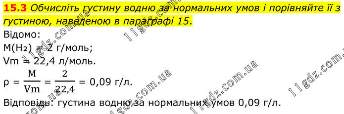 15.3 Обчисліть густину водню за нормальних умов і порівняйте її з густиною, наведеною в параграфі 15. Відомо: M(H₂) = 2 г/моль; Vm = 22,4 л/моль. ρ = М/Vm = 2/22,4 = 0,09 г/л. Відповідь: густина водню за нормальних умов 0,09 г/л.
