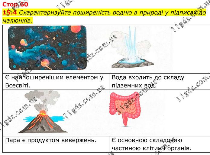 15.4 Схарактеризуйте поширеність водню в природі у підпи сах до малюнків. Є найпоширенішим елементом у Всесвіті. Вода входить до складу підземних вод. Пара є продуктом вивержень. Є основною складовою частиною клітин і органів.