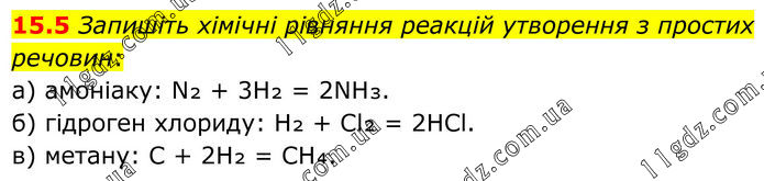 15.5 Запишіть хімічні рівняння реакцій утворення з прости х речовин: а) амоніаку: N₂ + 3H₂ = 2NH₃. б) гідроген хлориду: H₂ + Cl₂ = 2HCl. в) метану: C + 2H₂ = CH₄.