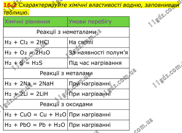 Схарактеризуйте хімічні властивості водню, заповнивши таблицю. Хімічні рівняння Умови перебігу Реакції з неметалами H₂ + Cl₂ = 2HCl На світлі H₂ + O₂ = 2H₂O За наявності полум’я H₂ + S = H₂S Під час нагрівання Реакції з металами H₂ + 2Na = 2NaH При нагріванні H₂ + 2Li = 2LiH При нагріванні Реакції з оксидами H₂ + CuO = Cu + H₂O При нагріванні H₂ + PbO = Pb + H₂O При нагріванні