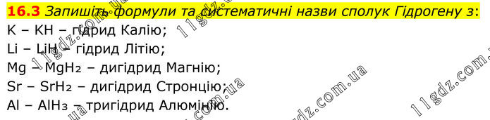 16.3 Зап ишіть формули та систематичні назви сполук Гідрогену з: K – KH – гідрид Калію; Li – LiH – гідрид Літію; Mg – MgH₂ – дигідрид Магнію; Sr – SrH₂ – дигідрид Стронцію; Al – AlH₃ – тригідрид Алюмінію.
