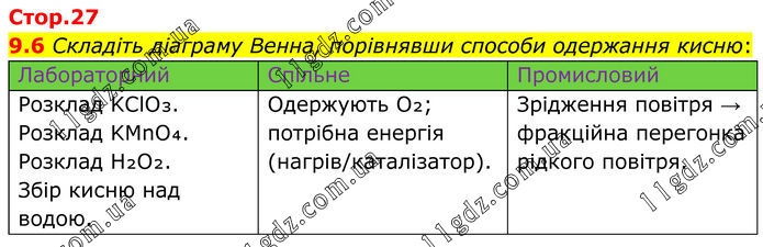 9.6 Складіть діаграму Венна, порівнявши способи одержання кисню: Лабораторний Спільне Промисловий Розклад KClO₃. Розклад KMnO₄. Розклад H₂O₂. Збір кисню над водою. Одержують O₂; потрібна енергія (нагрів/каталізатор). Зрідження повітря → фракційна перегонка рідкого повітря.