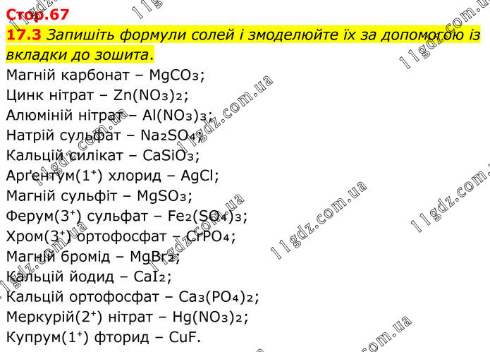 17.3 Запишіть формули солей і змоделюйте їх за допомогою із вкладки до зошита. Магній карбонат – MgCO₃; Цинк нітрат – Zn(NO₃)₂; Алюміній нітрат – Al(NO₃)₃; Натрій сульфат – Na₂SO₄; Кальцій силікат – CaSiO₃; Арґентум(1⁺) хлорид – AgCl; Магній сульфіт – MgSO₃; Ферум(3⁺) сульфат – Fe₂(SO₄)₃; Хром(3⁺) ортофосфат – CrPO₄; Магній бромід – MgBr₂; Кальцій йодид – CaI₂; Кальцій ортофосфат – Ca₃(PO₄)₂; Меркурій(2⁺) нітрат – Hg(NO₃)₂; Купрум(1⁺) фторид – CuF.
