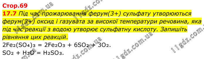 17.7 Під час прожарювання ферум(3+) сульфату утворюються ферум(3+) оксид і газувата за високої температури речовина, яка під час реакції з водою утворює сульфатну кислоту. Запишіть рівняння цих реакцій. 2Fe₂(SO₄)₃ = 2Fe₂O₃ + 6SO₂ + 3O₂. SO₂ + H₂O = H₂SO₃.