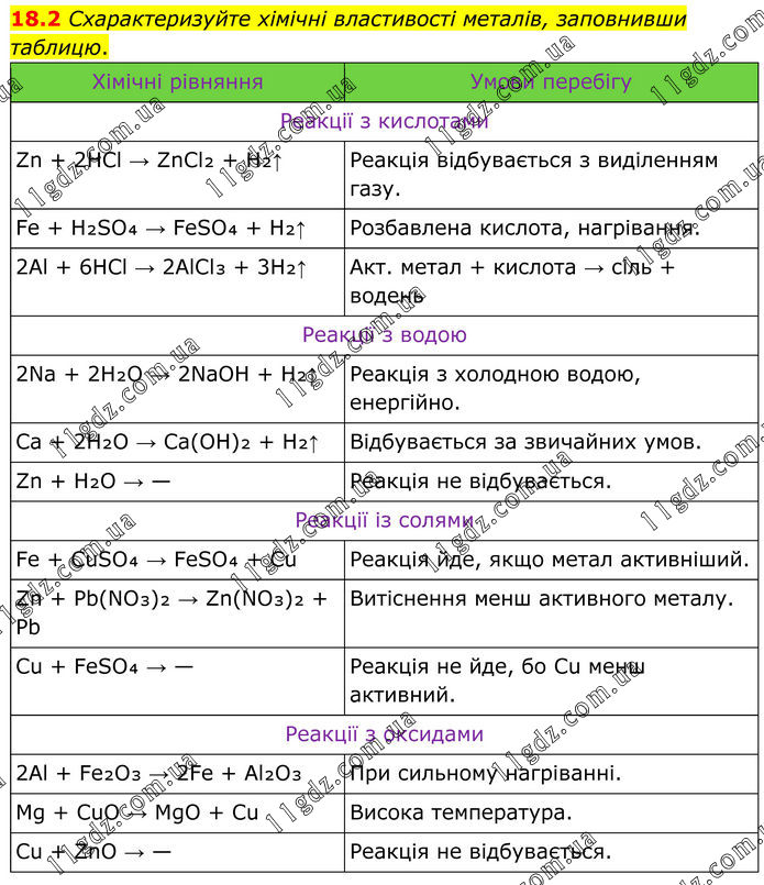 18.2 Схарактеризуйте хімічні властивості металів, заповнивши таблицю.