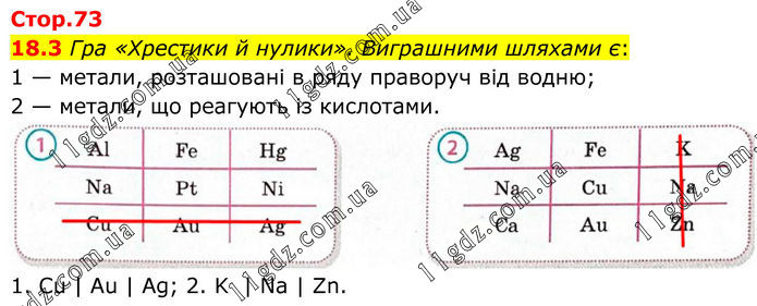 18.3 Гра «Хрестики й нулики». Виграшними шляхами є: 1 — метали, розташовані в ряду праворуч від водню; 2 — метали, що реагують із кислотами. 1. Cu | Au | Ag; 2. K | Na | Zn.
