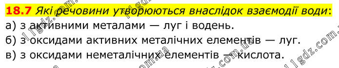 18.7 Які речовини утворюються внаслідок взаємодії води: а) з активними металами — луг і водень. б) з оксидами активних металічних елементів — луг. в) з оксидами неметалічних елементів — кислота.