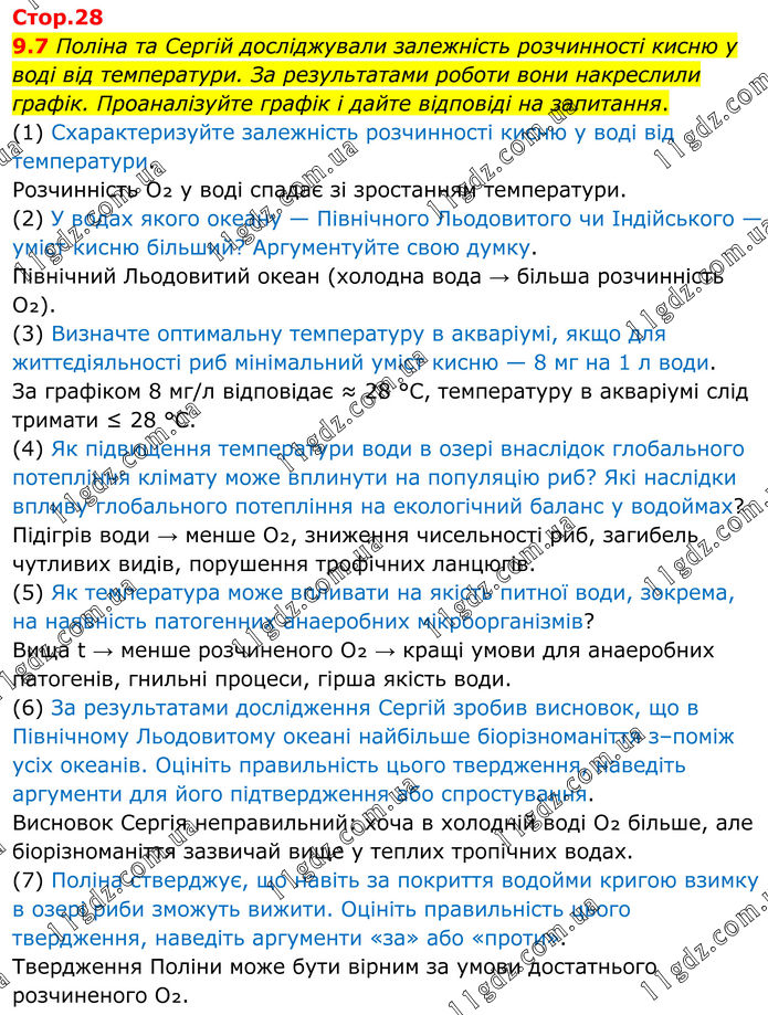 9.7 Поліна та Сергій досліджували залежність розчинності кисню у воді від температури. За результатами роботи вони накреслили графік. Проаналізуйте графік і дайте відповіді на запитання. (1) Схарактеризуйте залежність розчинності кисню у воді від температури. Розчинність O₂ у воді спадає зі зростанням температури. (2) У водах якого океану — Північного Льодовитого чи Індійського — уміст кисню більший? Аргументуйте свою думку. Північний Льодовитий океан (холодна вода → більша розчинність O₂). (3) Визначте оптимальну температуру в акваріумі, якщо для життєдіяльності риб мінімальний уміст кисню — 8 мг на 1 л води. За графіком 8 мг/л відповідає ≈ 28 °C, температуру в акваріумі слід тримати ≤ 28 °C. (4) Як підвищення температури води в озері внаслідок глобального потепління клімату може вплинути на популяцію риб? Які наслідки впливу глобального потепління на екологічний баланс у водоймах? Підігрів води → менше O₂, зниження чисельності риб, загибель чутливих видів, порушення трофічних ланцюгів. (5) Як температура може впливати на якість питної води, зокрема, на наявність патогенних анаеробних мікроорганізмів? Вища t → менше розчиненого O₂ → кращі умови для анаеробних патогенів, гнильні процеси, гірша якість води. (6) За результатами дослідження Сергій зробив висновок, що в Північному Льодовитому океані найбільше біорізноманіття з–поміж усіх океанів. Оцініть правильність цього твердження, наведіть аргументи для його підтвердження або спростування. Висновок Сергія неправильний: хоча в холодній воді O₂ більше, але біорізноманіття зазвичай вище у теплих тропічних водах. (7) Поліна стверджує, що навіть за покриття водойми кригою взимку в озері риби зможуть вижити. Оцініть правильність цього твердження, наведіть аргументи «за» або «проти». Твердження Поліни може бути вірним за умови достатнього розчиненого O₂.