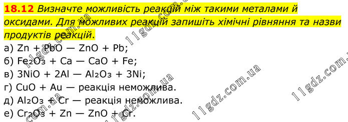 18.12 Визначте можливість реакцій між такими металами й оксидами. Для можливих реакцій запишіть хімічні рівняння та назви продуктів реакцій. а) Zn + PbO — ZnO + Pb; б) Fe₂O₃ + Ca — CaO + Fe; в) 3NiO + 2Al — Al₂O₃ + 3Ni; г) CuO + Au — реакція неможлива. д) Al₂O₃ + Cr — реакція неможлива. е) Cr₂O₃ + Zn — ZnO + Cr.
