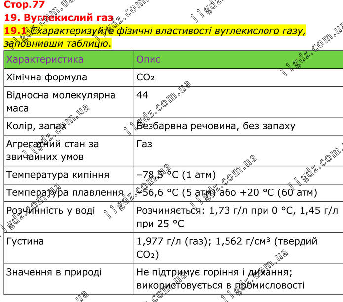 19. Вуглекислий газ 19.1 Схарактеризуйте фізичні властивості вуглекислого газу, заповнивши таблицю.