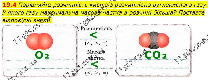 19.4 Порівняйте розчинність кисню з розчинністю вуглекислого газу. У якого газу максимальна масова частка в розчині більша? Поставте відповідні знаки.