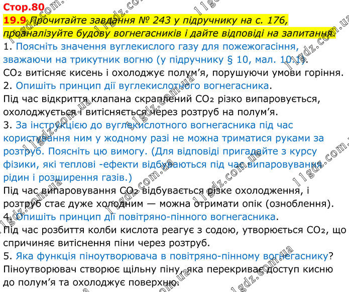 19.9 Прочитайте завдання № 243 у підручнику на с. 176, проаналізуйте будову вогнегасників і дайте відповіді на запитання. 1. Поясніть значення вуглекислого газу для пожежогасіння, зважаючи на трикутник вогню (у підручнику § 10, мал. 10.1). CO₂ витісняє кисень і охолоджує полум’я, порушуючи умови горіння. 2. Опишіть принцип дії вуглекислотного вогнегасника. Під час відкриття клапана скраплений CO₂ різко випаровується, охолоджується і витісняється через розтруб на полум’я. 3. За інструкцією до вуглекислотного вогнегасника під час користування ним у жодному разі не можна триматися руками за розтруб. Поясніть цю вимогу. (Для відповіді пригадайте з курсу фізики, які теплові -ефекти відбуваються під час випаровування рідин і розширення газів.) Під час випаровування CO₂ відбувається різке охолодження, і розтруб стає дуже холодним — можна отримати опік (озноблення). 4. Опишіть принцип дії повітряно-пінного вогнегасника. Під час розбиття колби кислота реагує з содою, утворюється CO₂, що спричиняє витіснення піни через розтруб. 5. Яка функція піноутворювача в повітряно-пінному вогнегаснику? Піноутворювач створює щільну піну, яка перекриває доступ кисню до полум’я та охолоджує поверхню.