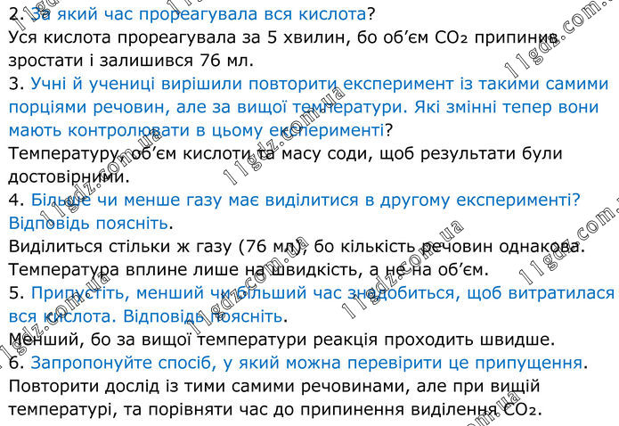 2. За який час прореагувала вся кислота? Уся кислота прореагувала за 5 хвилин, бо об’єм CO₂ припинив зростати і залишився 76 мл. 3. Учні й учениці вирішили повторити експеримент із такими самими порціями речовин, але за вищої температури. Які змінні тепер вони мають контролювати в цьому експерименті? Температуру, об’єм кислоти та масу соди, щоб результати були достовірними. 4. Більше чи менше газу має виділитися в другому експерименті? Відповідь поясніть. Виділиться стільки ж газу (76 мл), бо кількість речовин однакова. Температура вплине лише на швидкість, а не на об’єм. 5. Припустіть, менший чи більший час знадобиться, щоб витратилася вся кислота. Відповідь поясніть. Менший, бо за вищої температури реакція проходить швидше. 6. Запропонуйте спосіб, у який можна перевірити це припущення. Повторити дослід із тими самими речовинами, але при вищій температурі, та порівняти час до припинення виділення CO₂.