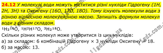 24.12 У молекулі води можуть міститися різні нукліди Гідрогену (1H, 2H, 3H) та Оксигену (16O, 17O, 18O). Тому існують молекули води з різною відносною молекулярною масою. Запишіть формули молекул води з різним складом. ¹H₂¹⁶O, ¹H²H¹⁷O, ³H₂¹⁸O. Скільки різних молекул може утворитися із цих нуклідів: а) за складом: 6 комбінацій Гідрогену × 3 нукліди Оксигену = 18. б) за масою: 13.