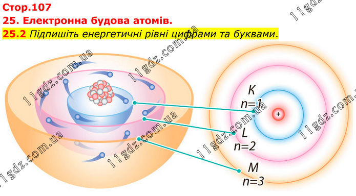 25. Електронна будова атомів. 25.2 Підпишіть енергетичні рівні цифрами та буквами.