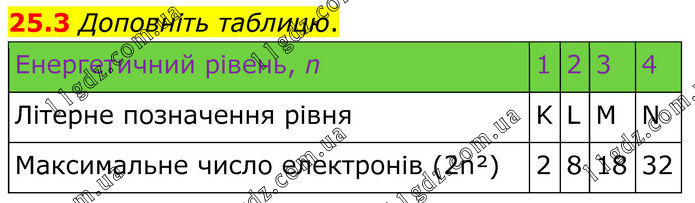 25.3 Доповніть таблицю. Енергетичний рівень, n 1 2 3 4 Літерне позначення рівня K L M N Максимальне число електронів (2n²) 2 8 18 32