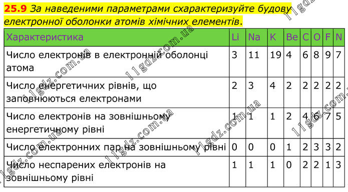 25.9 За наведеними параметрами схарактеризуйте будову електронної оболонки атомів хімічних елементів. Характеристика Li Na K Be C O F N Число електронів в електронній оболонці атома 3 11 19 4 6 8 9 7 Число енергетичних рівнів, що заповнюються електронами 2 3 4 2 2 2 2 2 Число електронів на зовнішньому енергетичному рівні 1 1 1 2 4 6 7 5 Число електронних пар на зовнішньому рівні 0 0 0 1 2 3 3 2 Число неспарених електронів на зовнішньому рівні 1 1 1 0 2 2 1 3