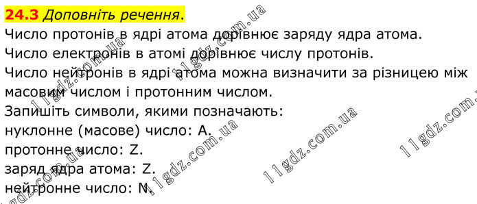 24.3 Доповніть речення. Число протонів в ядрі атома дорівнює заряду ядра атома. Число електронів в атомі дорівнює числу протонів. Число нейтронів в ядрі атома можна визначити за різницею між масовим числом і протонним числом. Запишіть символи, якими позначають: нуклонне (масове) число: A. протонне число: Z. заряд ядра атома: Z. нейтронне число: N.
