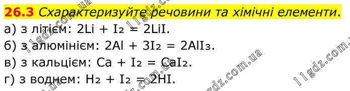 26.3 Схарактеризуйте речовини та хімічні елементи. а) з літієм: 2Li + I₂ = 2LiI. б) з алюмінієм: 2Al + 3I₂ = 2AlI₃. в) з кальцієм: Ca + I₂ = CaI₂. г) з воднем: H₂ + I₂ = 2HI.