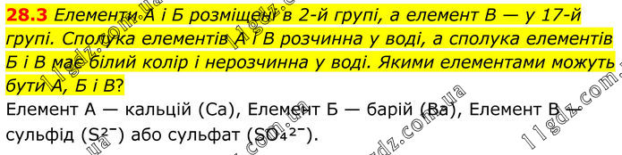 28.3 Елементи А і Б розміщені в 2-й групі, а елемент В — у 17-й групі. Сполука елементів А і В розчинна у воді, а сполука елементів Б і В має білий колір і нерозчинна у воді. Якими елементами можуть бути А, Б і В? Елемент A — кальцій (Ca), Елемент Б — барій (Ba), Елемент В — сульфід (S²⁻) або сульфат (SO₄²⁻).
