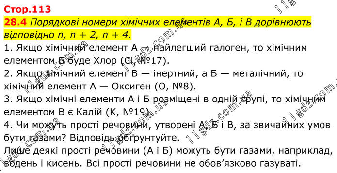 28.4 Порядкові номери хімічних елементів А, Б, і В дорівнюють відповідно n, n + 2, n + 4. 1. Якщо хімічний елемент А — найлегший галоген, то хімічним елементом Б буде Хлор (Cl, №17). 2. Якщо хімічний елемент В — інертний, а Б — металічний, то хімічний елемент А — Оксиген (O, №8). 3. Якщо хімічні елементи А і Б розміщені в одній групі, то хімічним елементом В є Калій (K, №19). 4. Чи можуть прості речовини, утворені А, Б і В, за звичайних умов бути газами? Відповідь обґрунтуйте. Лише деякі прості речовини (A і Б) можуть бути газами, наприклад, водень і кисень. Всі прості речовини не обов’язково газуваті.