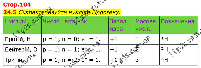 24.5 Схарактеризуйте нукліди Гідрогену. Нукліди Число частинок Заряд ядра Масове число Позначення Протій, H p = 1; n = 0; e⁻ = 1. +1 1 ¹H Дейтерій, D p = 1; n = 1; e⁻ = 1. +1 2 ²H Тритій, T p = 1; n = 2; e⁻ = 1. +1 3 ³H