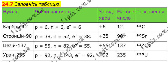 24.7 Заповніть таблицю. Нуклід Число частинок Заряд ядра Масове число Позначення Карбон-12 p = 6, n = 6, e⁻ = 6 +6 12 ¹²C Стронцій-90 p = 38, n = 52, e⁻ = 38. +38 90 ⁹⁰Sr Цезій-137 p = 55, n = 82, e⁻ = 55. +55 137 ¹³⁷Cs Уран-235 p = 92, n = 143, e⁻ = 92. +92 235 ²³⁵U