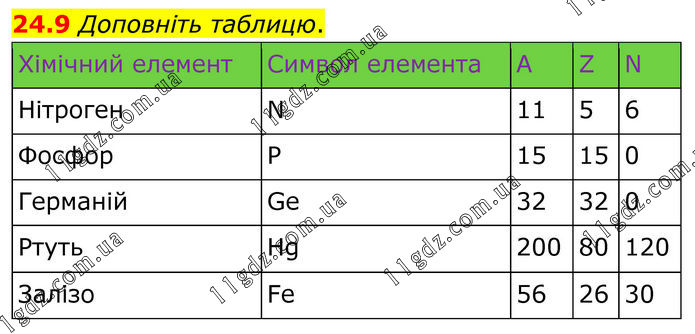 24.9 Доповніть таблицю. Хімічний елемент Символ елемента A Z N Нітроген N 11 5 6 Фосфор P 15 15 0 Германій Ge 32 32 0 Ртуть Hg 200 80 120 Залізо Fe 56 26 30