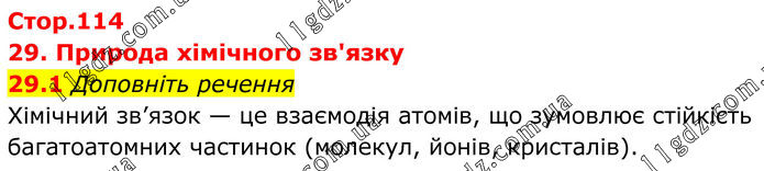 29. Природа хімічного зв'язку 29.1 Доповніть речення Хімічний зв’язок — це взаємодія атомів, що зумовлює стійкість багатоатомних частинок (молекул, йонів, кристалів).