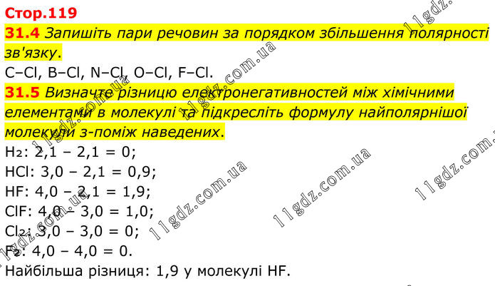 31.4 Запишіть пари речовин за порядком збільшення полярності зв'язку. C–Cl, B–Cl, N–Cl, O–Cl, F–Cl. 31.5 Визначте різницю електронегативностей між хімічними елементами в молекулі та підкресліть формулу найполярнішої молекули з-поміж наведених. H₂: 2,1 – 2,1 = 0; HCl: 3,0 – 2,1 = 0,9; HF: 4,0 – 2,1 = 1,9; ClF: 4,0 – 3,0 = 1,0; Cl₂: 3,0 – 3,0 = 0; F₂: 4,0 – 4,0 = 0. Найбільша різниця: 1,9 у молекулі HF.