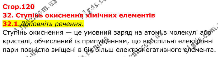 32. Ступінь окиснення хімічних елементів 32.1 Доповніть речення. Ступінь окиснення — це умовний заряд на атомі в молекулі або кристалі, обчислений із припущенням, що всі спільні електронні пари повністю зміщені в бік більш електронегативного елемента.