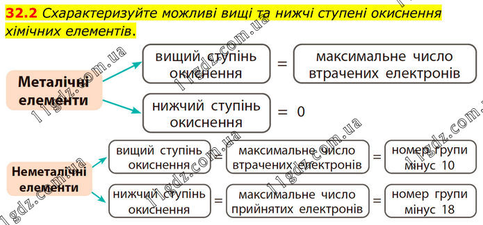 32.2 Схарактеризуйте можливі вищі та нижчі ступені окиснення хімічних елементів.